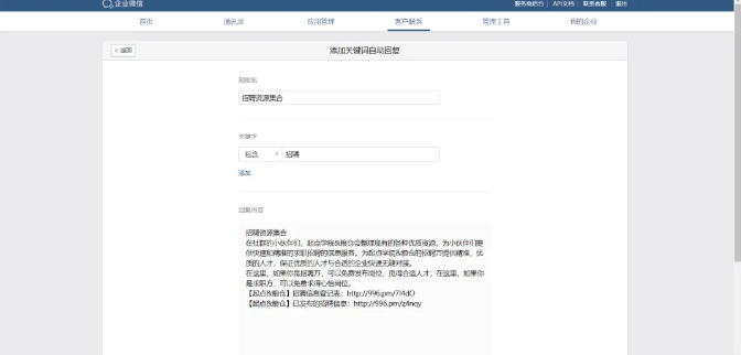 在關鍵詞選項還能設置包含或完全匹配,比如關鍵詞為“招聘”,在包含選項下,客戶發送“可在群里發招聘信息嗎”就會觸發自動回復,在完全匹配選項下,客戶必須發送“招聘”兩個詞才可以觸發自動回復。