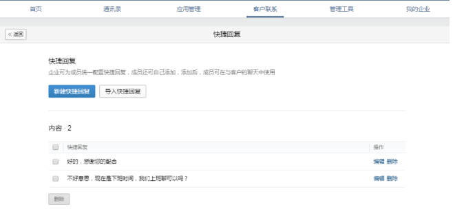 如果想規(guī)范員工的溝通話術(shù),可以使用企業(yè)微信的快捷回復(fù)功能。管理員能在企微管理后臺(tái)【客戶聯(lián)系】—【配置】—【快捷回復(fù)】中新建或?qū)胍颜砗玫脑捫g(shù),讓員工統(tǒng)一使用。