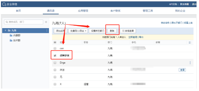 如果通過企微管理后臺刪除離職員工,進入通訊錄頁面后,勾選要刪除的員工,選擇頁面上的刪除即可。