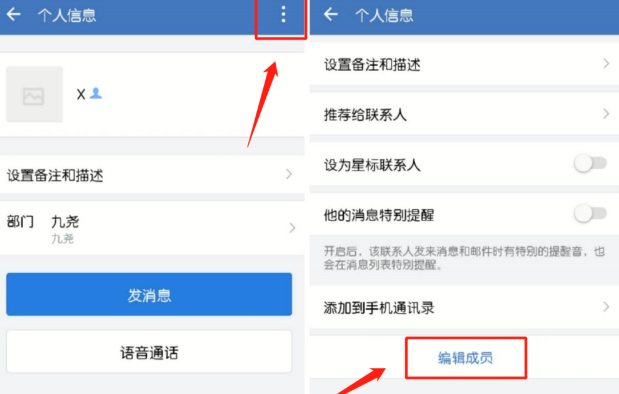 接著點擊離職成員個人信息頁面上的“三個點”,再點擊編輯成員,就會出現(xiàn)刪除成員選項。