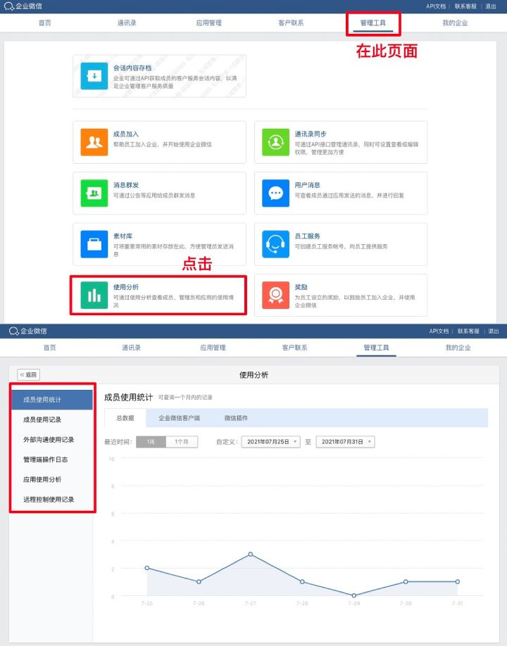 企業(yè)也可以登錄企業(yè)微信管理后臺(tái),在“管理工具”上有個(gè)“使用分析”,在這個(gè)使用分析里,可以查看到企業(yè)成員使用統(tǒng)計(jì)、成員使用記錄等分析數(shù)據(jù)。