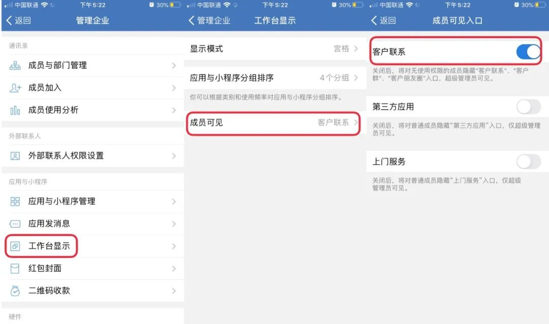企業(yè)微信管理員如果沒有開通入口,可以進去企業(yè)微信手機端,依次點擊“工作臺”——“管理企業(yè)”——“工作臺顯示”——“成員可見”,就可以看到“客戶聯(lián)系”是是開啟還是關閉狀態(tài)了。
