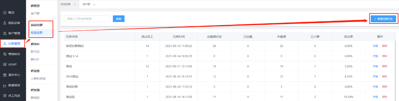 ①新建任務,點擊右上角[新建拉群任務]即可創建新任務。