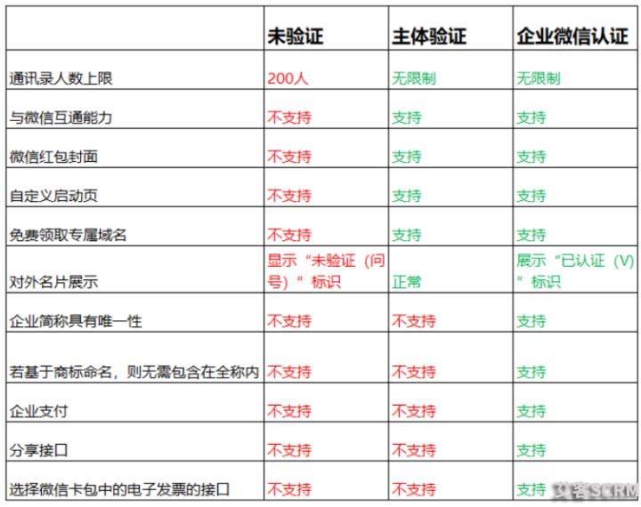 看下圖,我們知道未驗證的企業(yè)微信在通訊錄人數(shù)上限和已認證的企業(yè)微信相差很大,而在與微信互通、企業(yè)簡稱唯一性、企業(yè)支付等功能上是不支持的。
