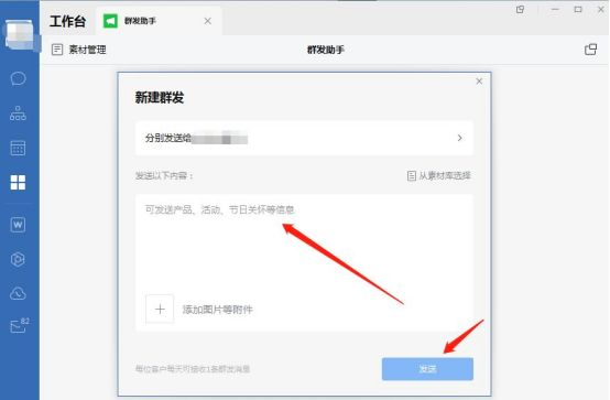 四、最后輸入【群發(fā)內(nèi)容】,點【發(fā)送】即可。