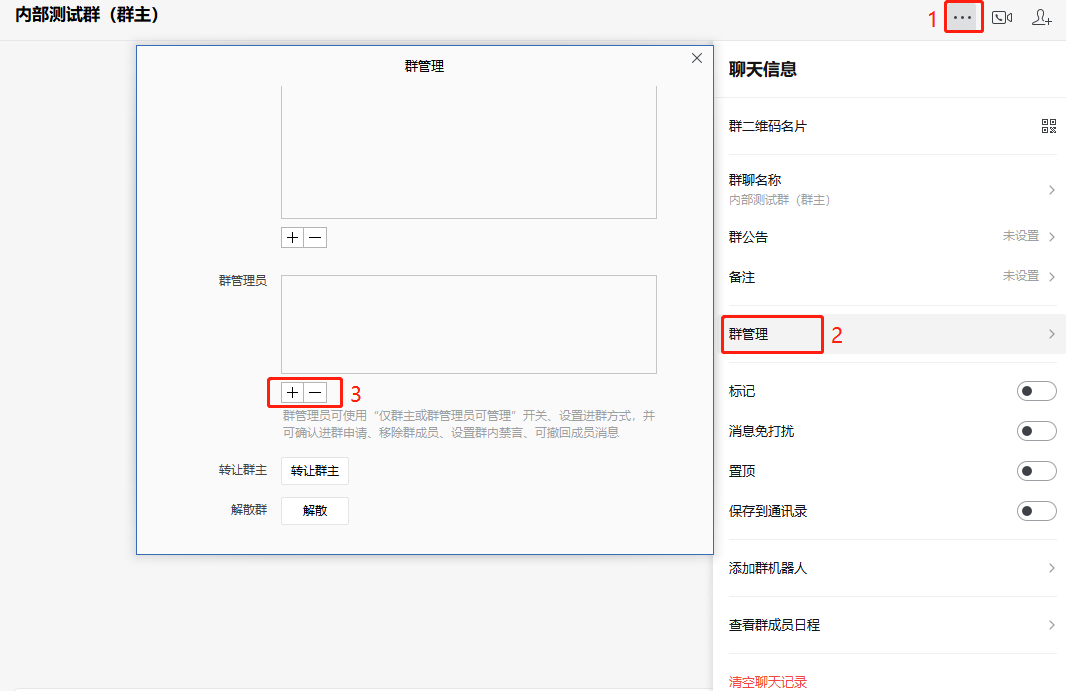 需要注意的是:每個群聊只支持添加3個群管理員,所以在群主和群管理員的選擇上,企業要慎重考慮好。并且僅支持企業內賬號為群管理員,不支持外部人員賬號為群管理員。
