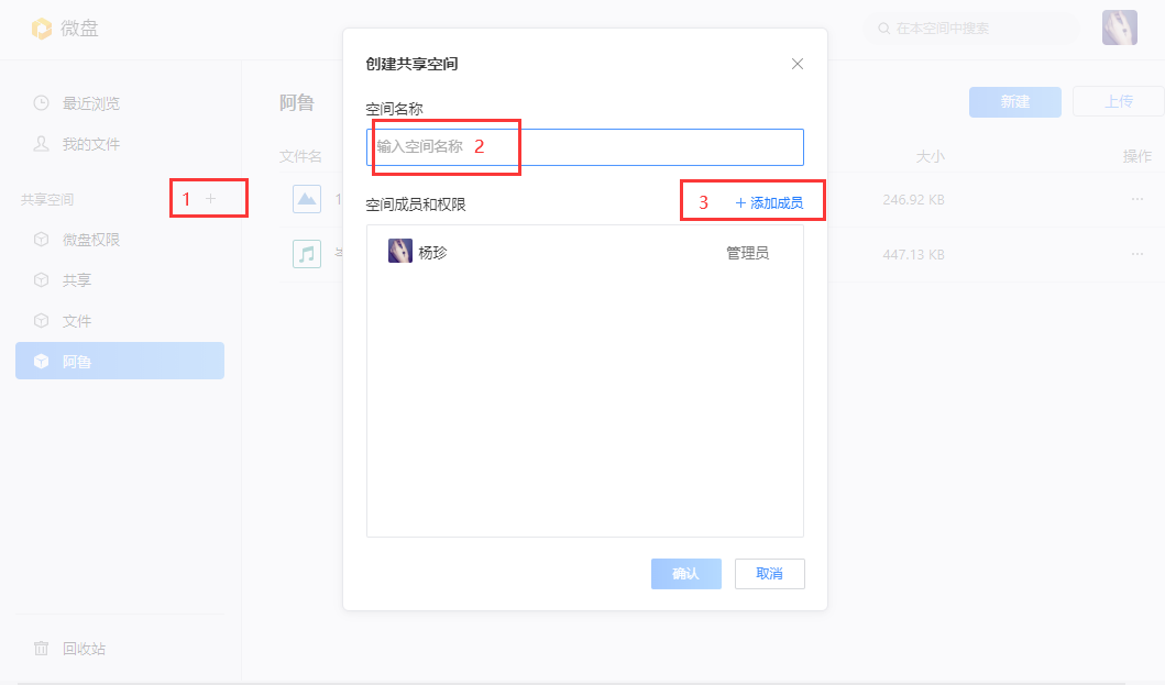 2、企業(yè)微信創(chuàng)建:登錄企業(yè)微信工作臺(tái),打開客戶端左側(cè)欄微盤圖標(biāo)—共享空間“+號(hào)”—“空間名稱”—“添加空間成員”,就可以創(chuàng)建成功了。