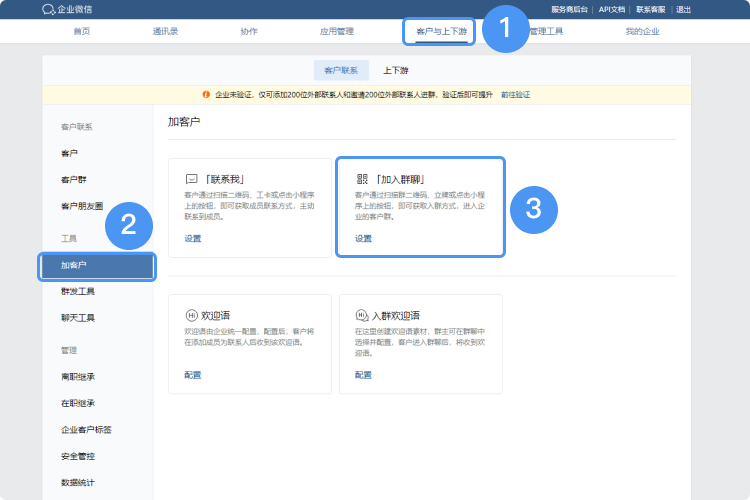 在電腦端創建:企業微信管理員登錄企業微信后臺,“客戶與上下游”——“客戶聯系”——“加客戶”——“加入群聊”,就可以創建一個群活碼供客戶掃描進入群聊了。