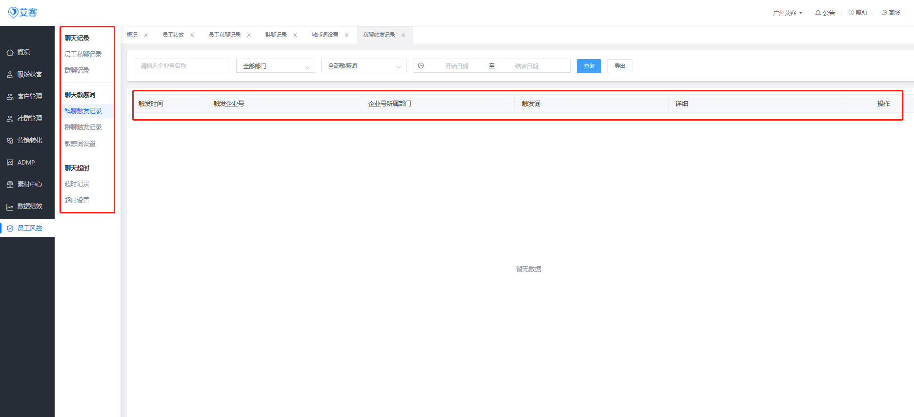 如果企業想詳細查看員工的敏感詞違規記錄和及時對員工的管理,推薦大家使用企業微信服務服務商——艾客SCRM,除了以上敏感詞設置攔截外,在艾客后臺設置敏感詞之后,銷售人員發送包含敏感關鍵詞的語句都會被禁止發送,并在艾客SCRM的后臺中會有敏感詞觸發記錄,能夠清楚的了解到是哪一位銷售員工觸發敏感詞,以及詳細內容,并可以導出數據,方便查看。