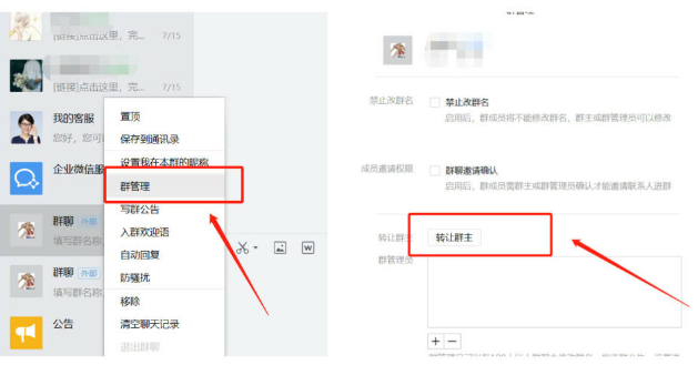 在客戶端會話列表中右鍵群聊,可以看到【群管理】選項,點擊【轉讓群主】操作即可,成功轉讓群主身份后也會出現群主轉讓的提示。