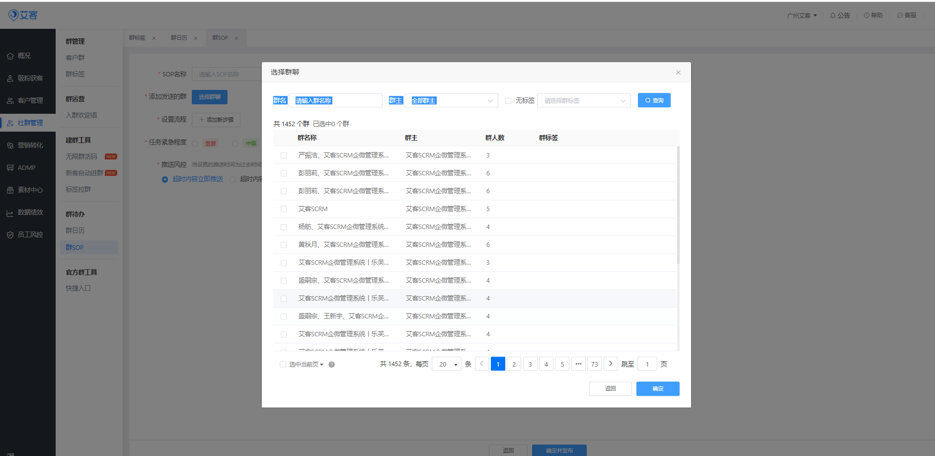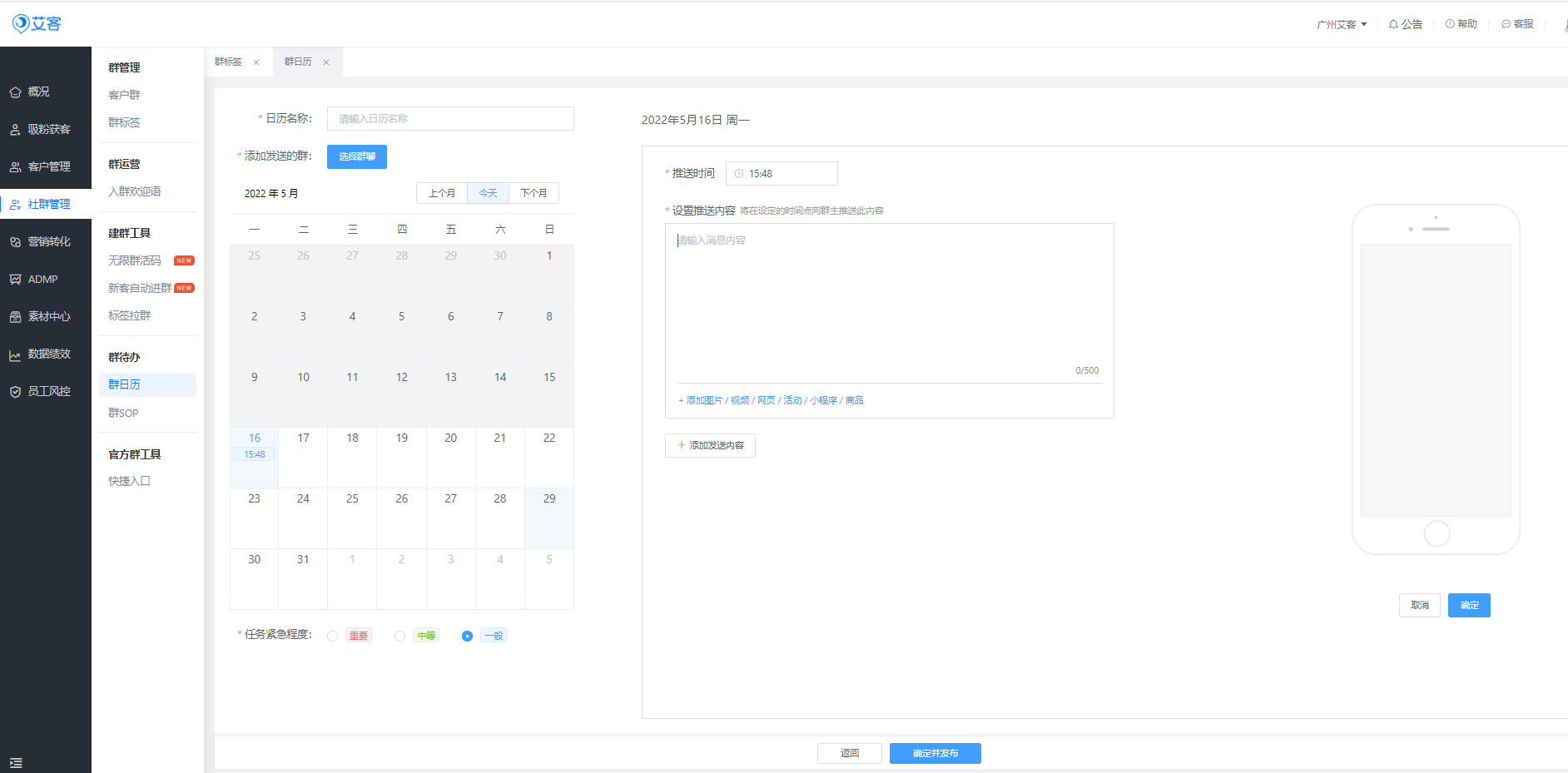 管理員不僅可以利用【艾客SCRM】制定SOP,每日準時提醒員工進行內容推送,還可以將本周、本月的工作安排提前設置在【群日歷】中,讓員工的工作安排一目了然。同時管理員還可以在群日歷中給對應的群添加日歷任務,到達指定時間后系統將自動通知對應的員工去執行對應的任務。