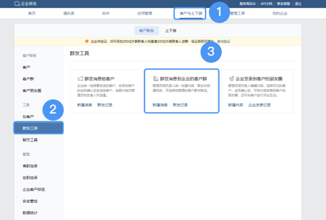 企業微信管理端路徑:【管理后臺】—【客戶與上下游】—【客戶聯系】—【群發工具】—【群發消息到企業的客戶群】。