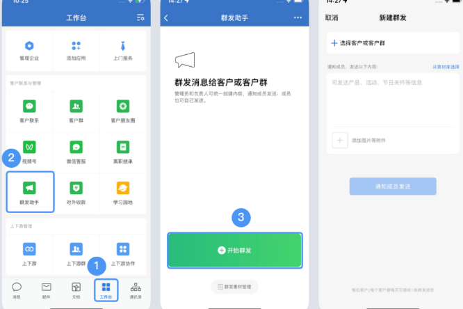 企業成員個人操作群發路徑:【企業微信手機端】—【工作臺】—【群發助手】。