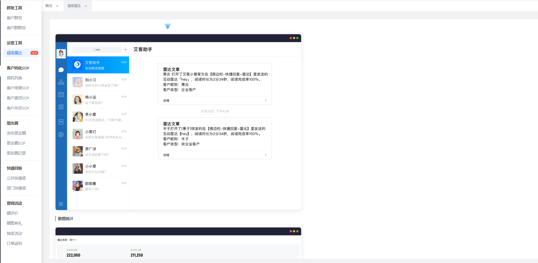 在給客戶群發(fā)送產(chǎn)品資料、產(chǎn)品鏈接時,我們可以使用艾客scrm提供的超級雷達功能,給這些資料添加上追蹤能力,我們就可以知道哪些客戶點擊了哪些資料、瀏覽進度,對我們哪些產(chǎn)品比較感興趣,進行重點跟進,不錯過任何一個意向客戶,提高轉(zhuǎn)化。