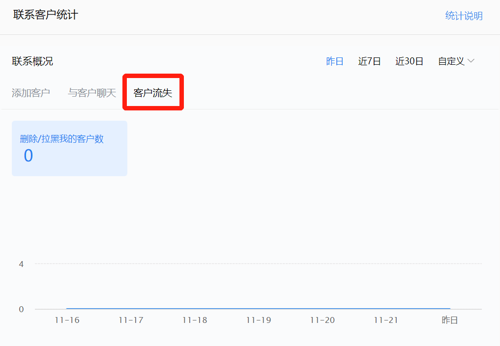 企業(yè)微信如果想要查看客戶流失情況,可以登錄企業(yè)微信后臺或者手機端“工作臺”——“客戶聯(lián)系”——“聯(lián)系客戶統(tǒng)計”,客戶流失情況可以選擇查看“昨日”、“近7日”、“近30日”、“自定義”。