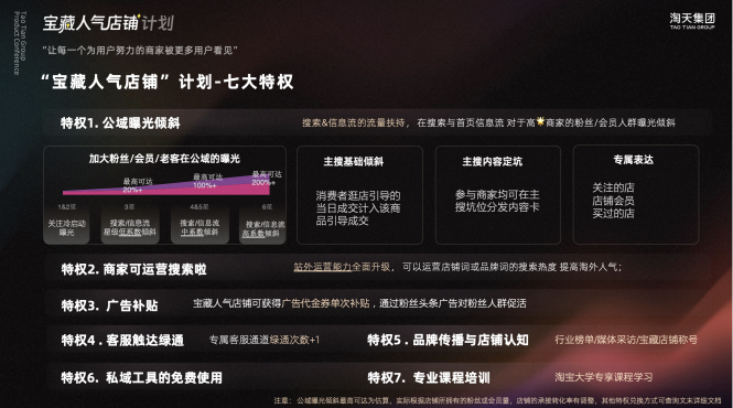 具體就要從淘寶天貓的寶藏人氣店鋪計劃說起,淘天集團投入億元補貼扶持商家,推出“寶藏人氣店鋪”計劃,鼓勵商家對粉絲、會員、老客等人群創造新品尖貨,提供驚喜福利,持續種草用戶,獲取店鋪的人氣增長。得到準入的寶藏人氣店鋪獲得相應的人氣增長量將會獲得七大特權,包括公域直接曝光傾斜、運營搜索詞的能力、店鋪傳播與品牌聲量、專業課程培訓、私域工具免費試用、用戶觸達綠色通道、廣告代金券補貼等平臺曝光補貼。