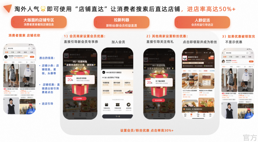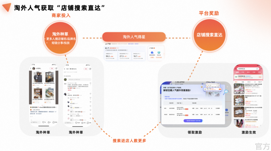 商家獲得的淘外人氣到達到相應額度可以獲得店鋪星級,任意星級即可解鎖店鋪直通權益,獲得店鋪搜索直達特權,消費者搜索店鋪名稱時,店鋪小條、店鋪優惠、新粉絲/會員權益禮包等直戳入店,提升搜索進店率,站外內容種草獲得更高收益。
