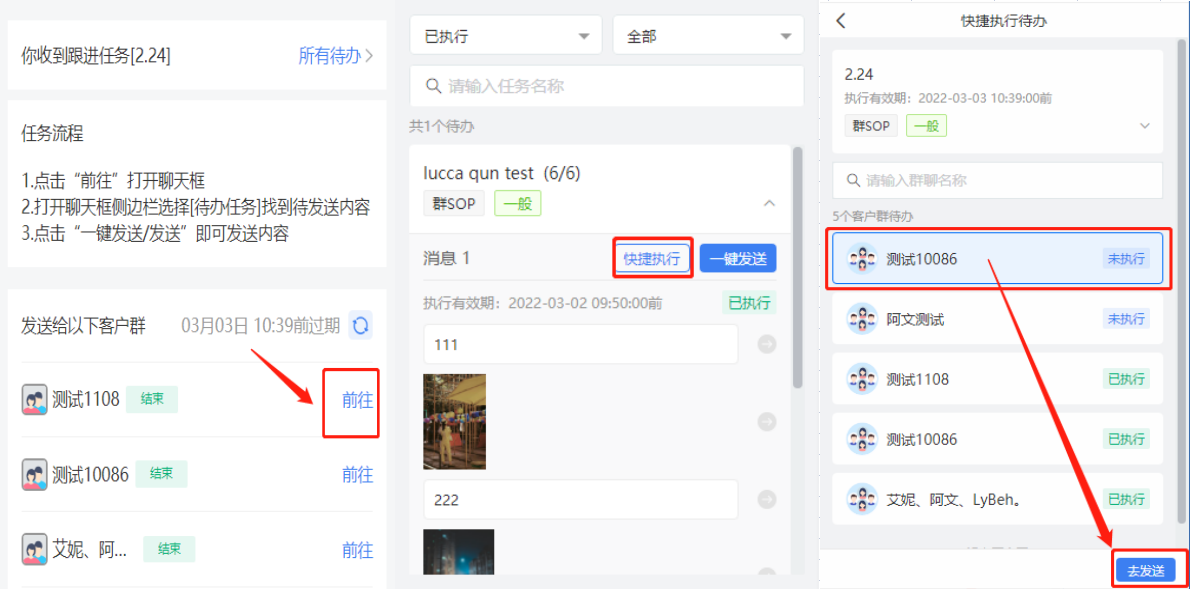 對于日常發送的活動消息,企業利用群SOP功能進行推送會比較合適。企業只需要制定好群SOP線性任務,當任務達到條件時,系統會自動給執行的人員發送通知,執行人員收到通知之后一鍵點擊發送即可。此功能還能清晰知道哪些群組執行了推送任務,哪些群組沒有執行推送任務。