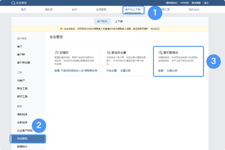 企業微信自帶的功能中是有對應的聊天敏感詞設置的,企業微信管理員只需要登錄企業微信管理后臺,在“客戶與上下游”——“客戶聯系”——“安全管控”——“聊天敏感詞”,就可以設置敏感詞了。設置成功后,當企業成員發送給客戶的消息包含敏感詞時,系統將給該成員發送提示或者發送失敗。